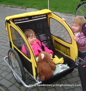 Yes, we have a child trailer for hire. This can accommodate one or two children. The manufacturers state that it is suitable from the age of 18 months and for a weight of 40 kg (if two children ride then this is the combined weight). It can easily be fitted onto our hire bikes.
